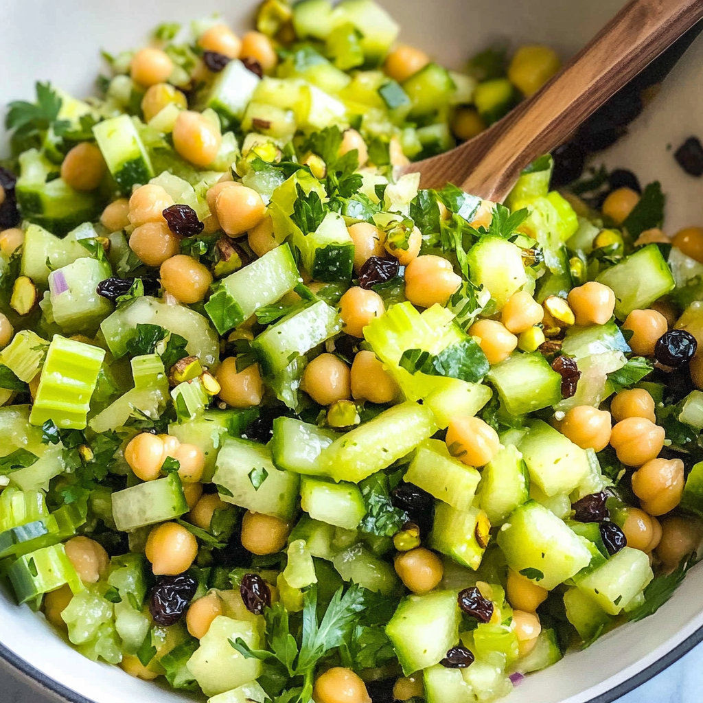 Chopped Celery Salad with Chickpeas and Raisins is a delightful dish that brings together fresh flavors and a variety of textures. This Celery Salad with Chickpeas and Raisins is perfect for any occasion, whether it’s a summer picnic, a quick lunch, or a vibrant side dish for dinner. The combination of crunchy celery, sweet raisins, and nutty pistachios creates a refreshing salad that is both satisfying and nutritious.