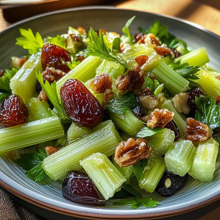 Celery Salad with Dates and Walnuts is a delightful dish that brings together the fresh crunch of celery, the natural sweetness of Medjool dates, and the rich texture of walnuts. This salad is not only easy to prepare but also versatile enough to be served at picnics, lunch gatherings, or as a side dish at dinner parties. Its vibrant colors and unique combination of flavors make it an eye-catching addition to any meal.