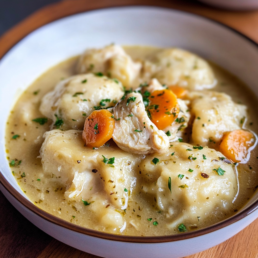 This recipe features a rich, creamy broth filled with tender chicken and fluffy dumplings made from scratch, making every bite comforting and satisfying.