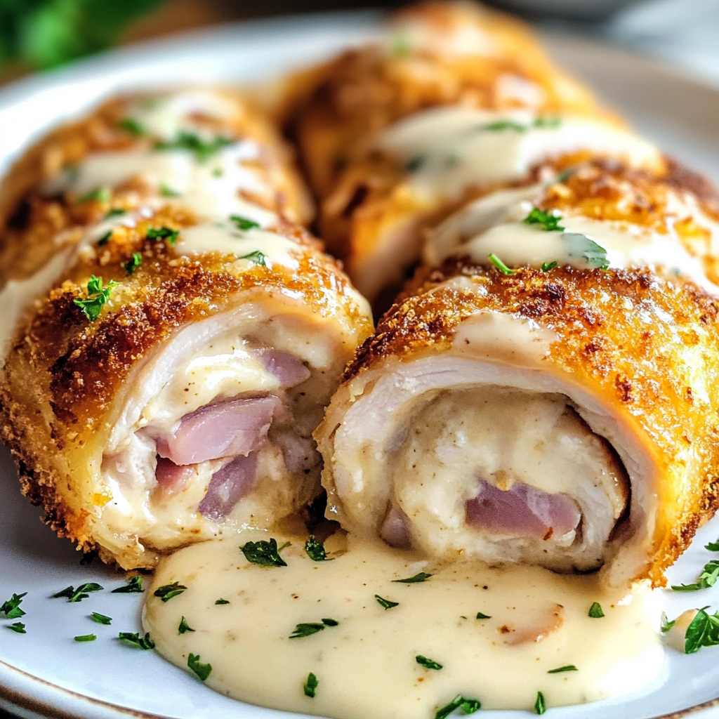 Bring restaurant-quality flavor to your kitchen with this classic Chicken Cordon Bleu. This dish features crispy, golden-baked chicken breasts rolled with savory chicken ham and melty Swiss cheese. Finished with a luscious Dijon-Parmesan cream sauce, it is perfect for family dinners or elegant entertaining. Timeless, cheesy, and absolutely satisfying, this recipe is sure to impress.