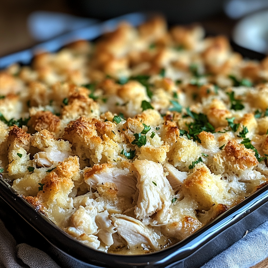 Dolly’s Chicken and Stuffing Casserole is a creamy chicken dish topped with crispy stuffing, perfect for family dinners or gatherings.