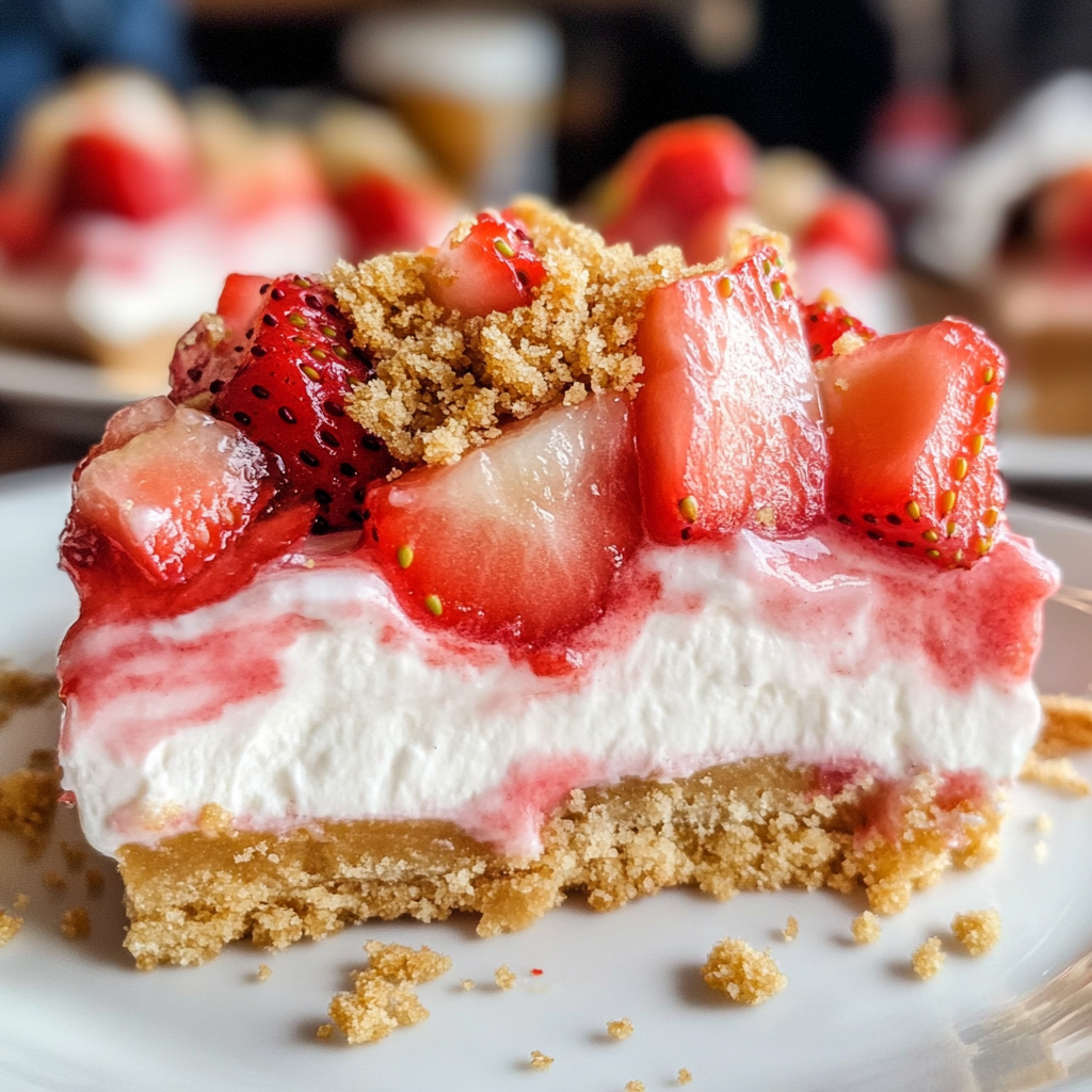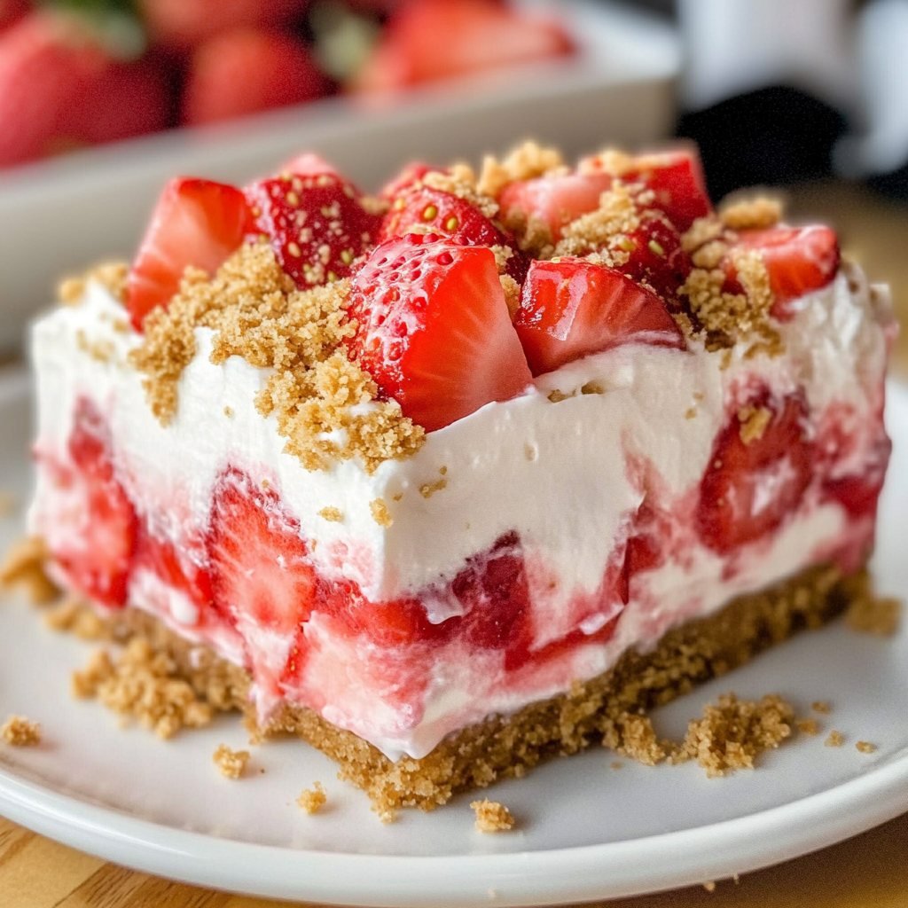 Strawberry Delight is a no-bake dessert that combines layers of creamy filling with fresh strawberries and a crunchy crust made from graham cracker crumbs.