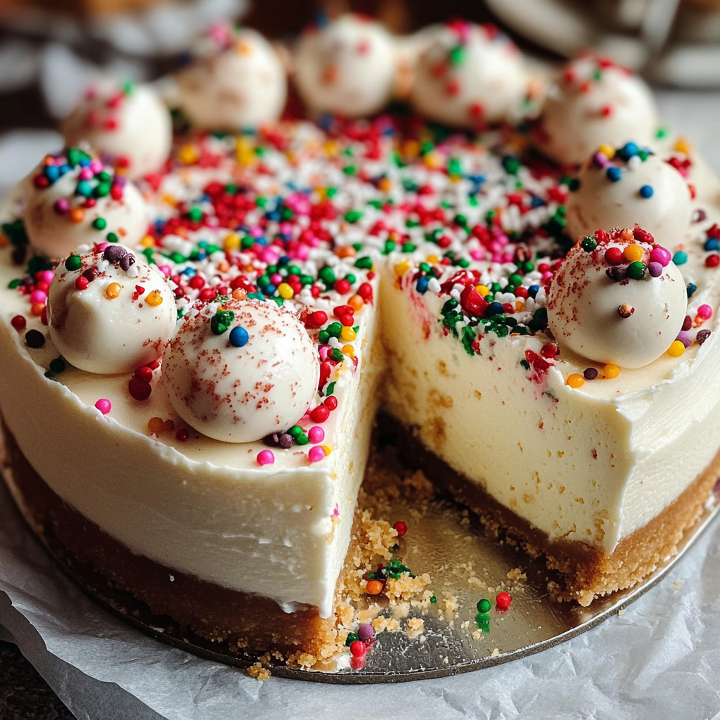 A Sugar Cookie Cheesecake Dessert is a delightful blend of creamy cheesecake filling atop a sweet sugar cookie crust, often adorned with cookie dough balls and festive sprinkles.