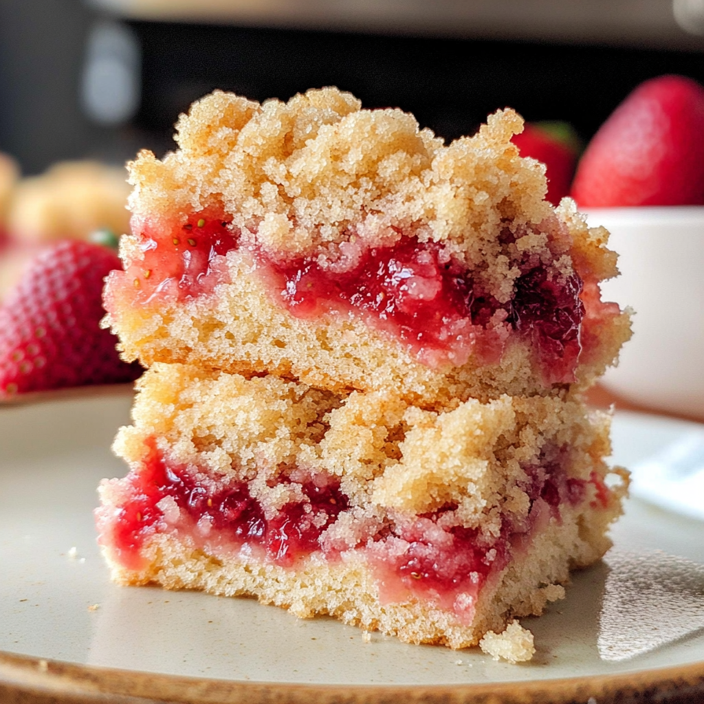 This cake combines layers of fluffy vanilla cake with sweet strawberries and a crunchy crumb topping, offering both texture and flavor.