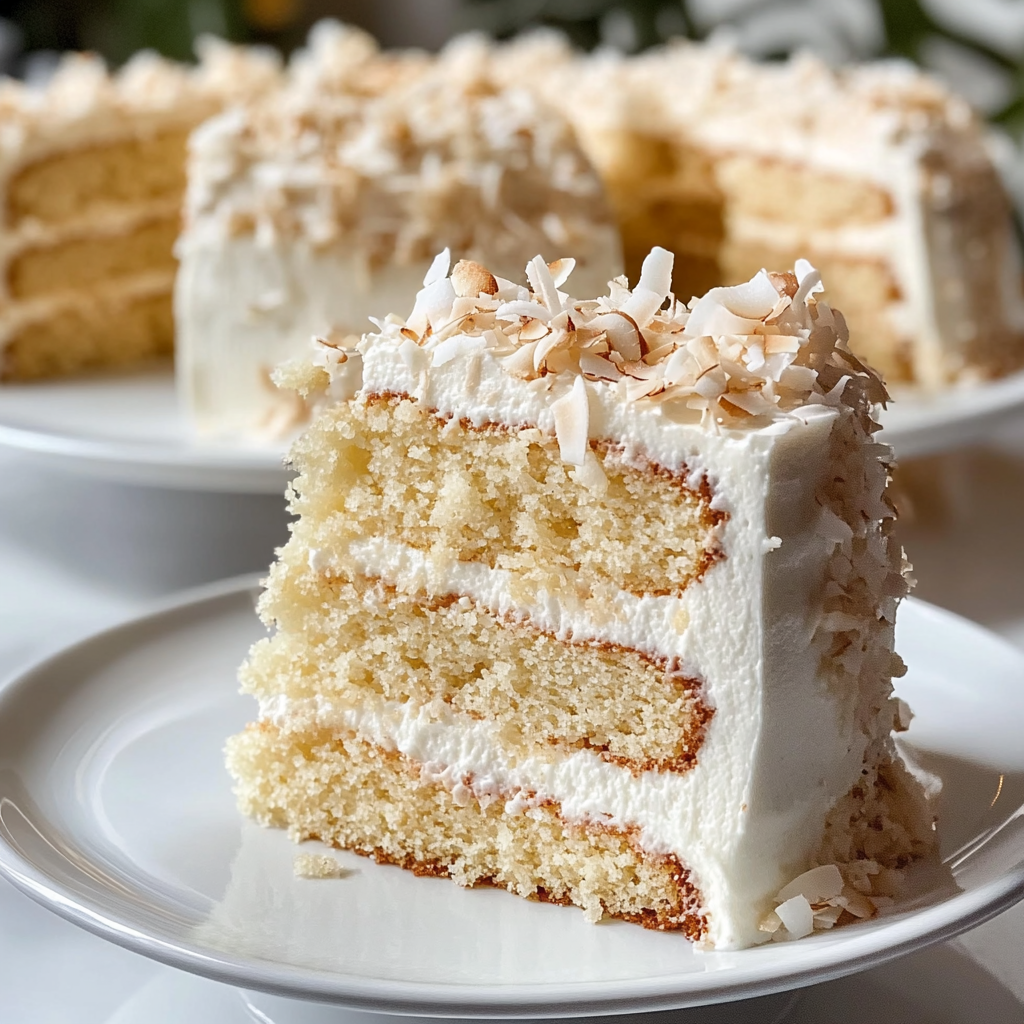 This cake features almond layers paired with a creamy coconut filling and white chocolate buttercream, making it a unique winter dessert.